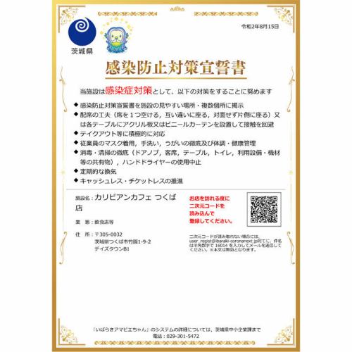 当店は『いばらきアマビエちゃん』登録店舗です。お客様に安心してご利用いただけるよう、ガイドラインに沿って感染予防・拡大防止に努めてまいります。